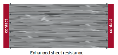 Transparent conductive materials excel in electrical conductivity and in optical transparency at the same time. The challenge for TCM manufactures is that the electrical resistance can be improved by adding more material which is then worsening the transparency. Many companies compete for providing the best sheet resistance to transparency ratio. Nanowire, tube and mesh structure are able to provide outstanding SR to OT rations at good costs. There are some cases where the conductivity of a film is directed to the electrodes which results in even better SR to OT rations. The key points of this concept are shown here: