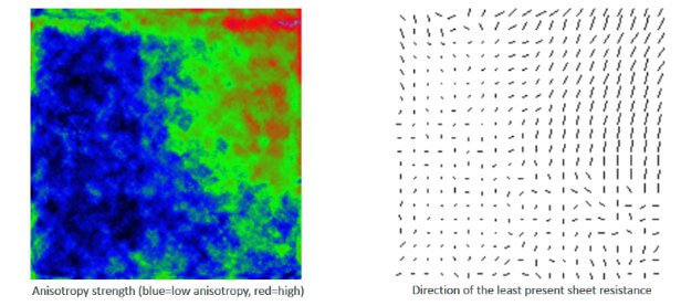 Non-contact measurement of electrical anisotropy is done by SURAGUS Eddy Current anisotropy sensors. Those are especially designed to induce currents in defined directions such as MD = Machine Direction | TD – Transversal Direction. There are single point measurement systems and imaging measurement systems proving in detail information on anisotropy strength and direction across the entire sample. Examples for sheet resistance anisotropy depiction are shown below. The first images shows the individual sheet resistances RMD and RTD and the absolute and relative calculated values. The right image depicts the anisotropy distribution across a sample where blue represents anisotropic areas and red anisotropic areas. The black and white line image depicts the anisotropy strength as length of the lines where dots represent isotropic areas and long lines anisotropic areas. The direction of anisotropy is exposed by the direction of a line.