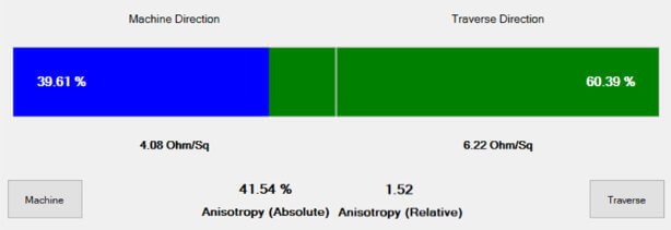 The relevant directions for anisotropy calculation are the minimum (Rdirection min) and the maximum (Rdirection max) sheet resistance direction. Most inline manufacturing processes tend to align the wires into machine direction when transferring wire or tube material onto moving web. Therefore, the best or minimum sheet resistance is present in machine direction. Consequently, the worst or highest sheet resistance is achieved into the traversing direction.