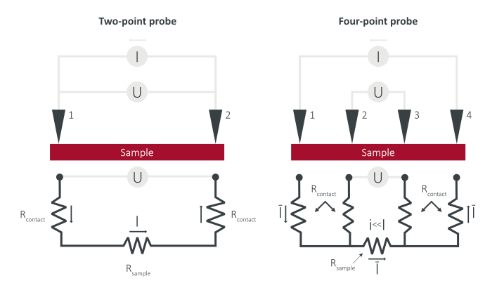 Contact and propagation resistance are very high when using two-point probes. This means that the resistance of the sample cannot be isolated. This is the advantage of the four-point method. The contact and propagation resistances of the voltage probes are very low, which makes the measurement accuracy very high. This is because two wires are used, one to induce the current and the other to measure the drop in voltage.The be clear: a two point probe measures the combined resistivity of the sample, the contact resistance and the probe resistance whereas a four-point probe only measures the sample resistivity.