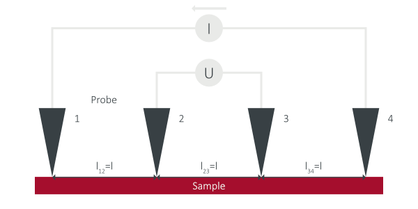 As described before, four-probe measurement works by contacting four equally-spaced probes to a conductive surface. Between probe 1 and 4 a current is applied. Then the voltage between probe 2 and 3 drops and is measured. With the known values for U and I, the sheet resistance can be calculated.