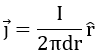 If the current flows through the contacts into the layer under investigation with a uniform resistivity, then the current spreads out in a circle. The current density can be given by: