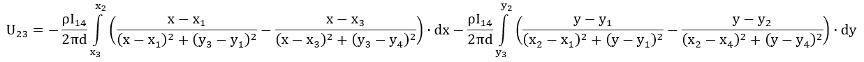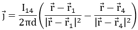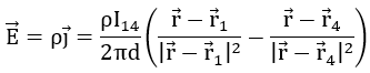 The current is induced at location r1 and drawn at location r4. This produces a typical dipole pattern. For the thin film approximation, the distance between the peaks must be much larger than the thickness of the thin film. Then the current density can be given by: