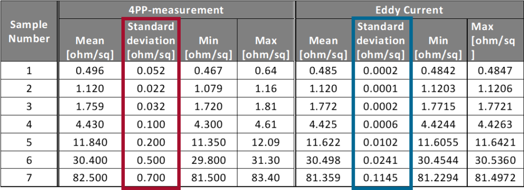 However, the eddy current method not only enables faster measurements, but also more reliable measurements. The repeatability of the eddy current measurement significantly exceeds the repeatability of the 4PP measurement.