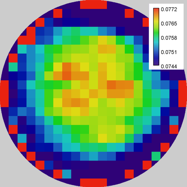 A typical measurement result from a 4PP mapping tool consists of 9 to 49 points. The primary data source for the map includes 9 measured points, while the rest is generated through interpolation. This creates a visually distinguishable map but does not provide additional information beyond the measured data.